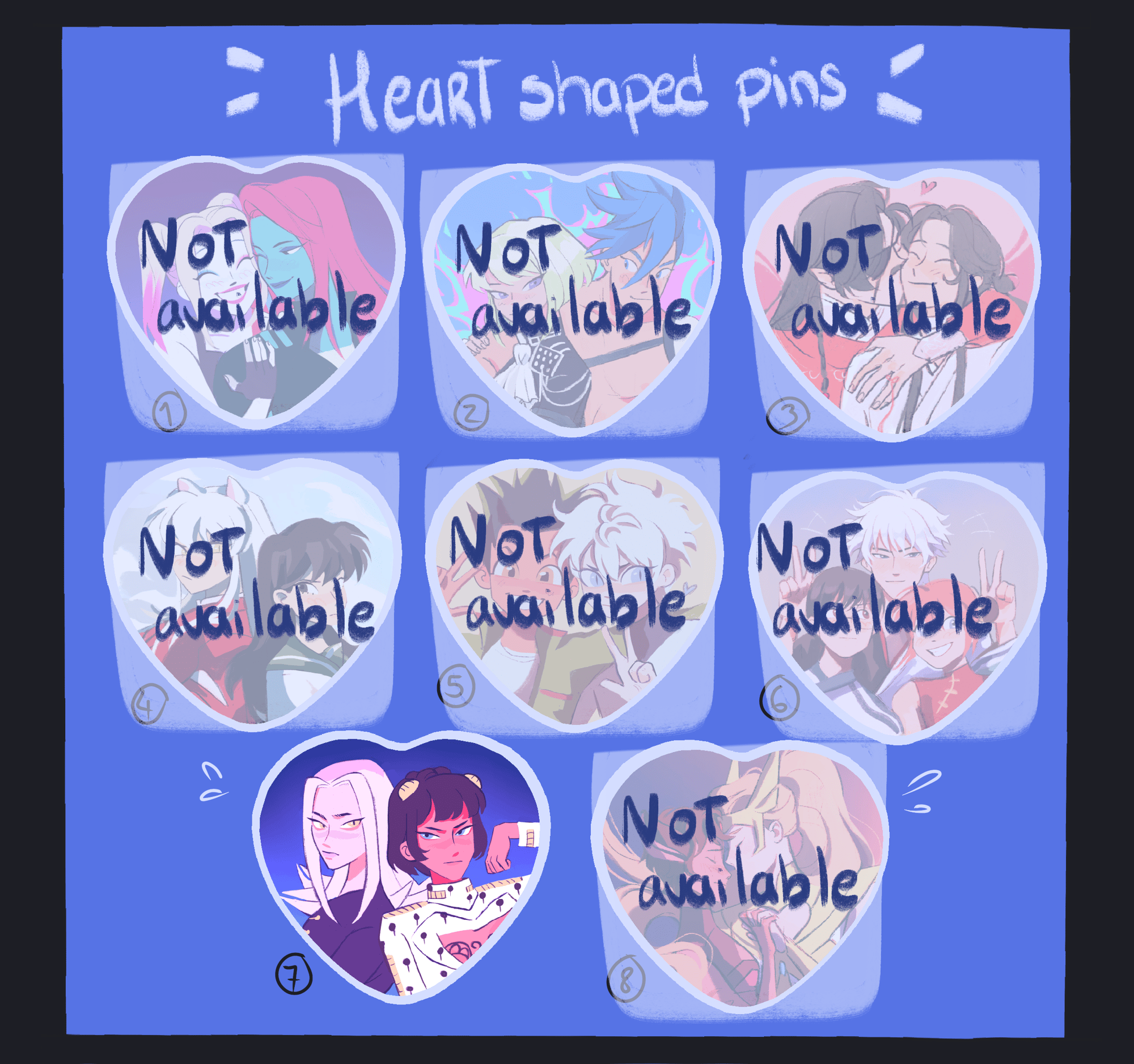 This is a preorder for these heart shaped pin designs (the tgcf one is p4p only) so keep in mid they will take longer to be shipped out